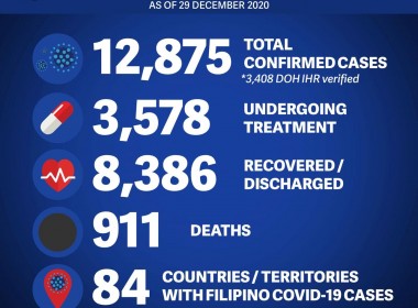 (Eagle News) — Ten more Filipinos abroad have recovered from COVID-19. The Department of Foreign Affairs said with the additional recoveries, the total number of Filipinos overseas who recovered from the disease rose to 8386. Twenty-eight more cases, however, pushed the COVID-19 total to 12875. No additional fatality was reported, which means the death toll remains at 911. The Middle East and Africa are still the regions with the most COVID-19 cases, recoveries and deaths […]