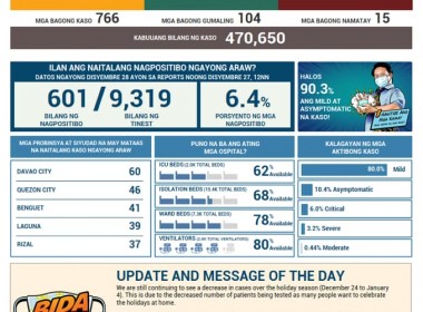 (Eagle News) — COVID-19 cases in the country breached the 470,000 mark on Monday, December 28, after the Department of Health reported 766 additional cases. The DOH said of the total 470,650 cases, 22746 were active. Of these, 80 percent were mild, 10.4 percent were asymptomatic, six percent were critical, 3.2 percent were severe, and 0.44 percent were moderate. The areas with the most COVID-19 cases reported today were Davao City with 60, Quezon City […]