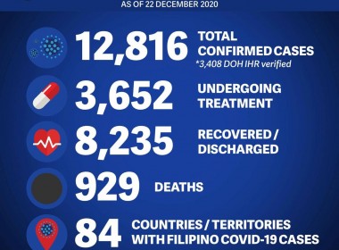 (Eagle News)– One more Filipino abroad has recovered from COVID-19. The Department of Foreign Affairs said with the additional recovery, the total number of overseas Filipinos who recovered from the disease rose to 8235. No additional case was reported, which means the total COVID-19 cases among Filipinos abroad remains at 12816. An additional death, however, pushed the death toll to 929. The Middle East and Africa are still the regions with the most COVID-19 cases, […]