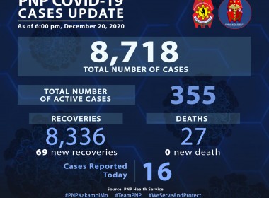 (Eagle News) — Sixty-nine more police personnel have recovered from COVID-19. With the additional recoveries, the Philippine National Police said the COVID-19 recovery total rose to 8336. Sixteen additional cases pushed the total to 8718. Of these, 355 were active. No additional deaths were reported, which means the death toll remains at 27. The government has said uniformed personnel–including the police—were among the priorities in a COVID-19 national vaccination program should a vaccine be available. […]
