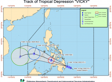 (Eagle News) — Signal No. 1 has been raised over parts of the country as Tropical Depression “Vicky” continued to move toward the Davao Oriental-Surigao del Sur area. In its recent advisory, the Philippine Atmospheric Geophysical and Astronomical Services Administration said the northern and central portion of Palawan (Puerto Princesa City, Roxas, San Vicente, Dumaran, Araceli, Taytay, El Nido) including Calamian, Cuyo, and Cagayancillo Islands in Luzon; the southern portion of Leyte (Baybay City, Javier, […]