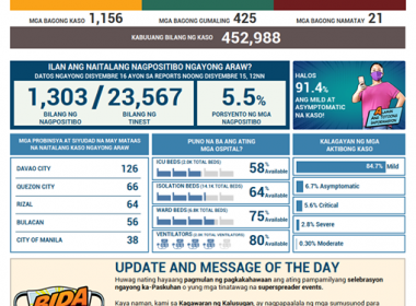 (Eagle News) — COVID-19 cases in the country breached the 452,000 mark on Wednesday, December 16, after the Department of Health reported 1156 additional cases. The DOH said of the 452,988 total cases, 5.5 percent or 24873 were active. Of these, 84.7 percent were mild, 6.7 percent asymptomatic, 5.6 percent critical, 2.8 percent severe, and 0.3 percent moderate. The areas with the most COVID-19 cases reported today were Davao City with 126, Quezon City with […]