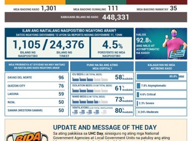 (Eagle News) — COVID-19 cases in the country breached the 448,000 mark on Saturday, December 12, after the Department of Health reported 1301 additional cases. The DOH said of the 448,331 total COVID-19 cases, 6.7 percent or 30,168 were active. Of these, 85.8 percent were mild, 7 percent asymptomatic, 4.6 percent critical, 2.3 percent severe, and 0.24 percent were moderate. The areas with the most COVID-19 cases reported today were Davao del Norte with 96, […]