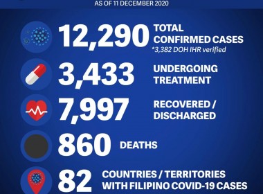 (Eagle News) — Over 400 more Filipinos abroad have recovered from COVID-19. The Department of Foreign Affairs said the 419 new recoveries pushed the COVID-19 recovery total among overseas Filipinos to 7997. Over 500, or 591, new cases, however, also pushed the total COVID-19 cases to 12,290. Thirteen additional deaths led to an increase in the death toll to 860. “The reported increases are due to belated reports in one country in Asia and the […]