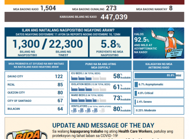 (Eagle News) — COVID-19 cases in the country breached the 447,000 mark on Friday, December 11, after the Department of Health reported 1504 additional cases. The DOH said of the 447,039 total cases, 6.5 percent or 29,001 were active. Of these, 85. 8 percent were mild, 6.7 percent asymptomatic, 4.8 percent critical, 2.4 percent severe, and 0.25 percent moderate. The areas with the most COVID-19 cases reported today were Davao City with 122, Rizal with […]