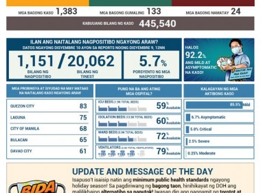 (Eagle News) — COVID-19 cases in the country reached 445,540 on Thursday, December 10, after the Department of Health reported 1383 additional cases. The DOH said of the total cases, 27781 or 6.2 percent were active. Of these, 85.5 percent were mild, 6.7 percent asymptomatic, 5 percent critical, 2.5 percent severe, and 0.25 percent moderate. The areas with the most COVID-19 cases reported today were Quezon City with 83, Laguna with 75, Manila with 68, […]
