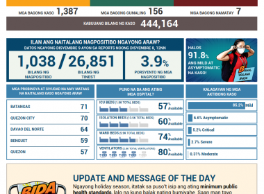 (Eagle News) — COVID-19 cases in the country breached the 444,000 mark on Wednesday, December 9, after the Department of Health reported 1,387 additional cases. The DOH said of the 444,164 total cases, 6 percent or 26,545 cases were active. Of these, 85.2 percent were mild, 6.6 percent asymptomatic, 5.2 percent critical, 2.7 percent severe, and 0.31 percent moderate. The areas with the most COVID-19 cases reported today were Batangas with 71, Quezon City with […]