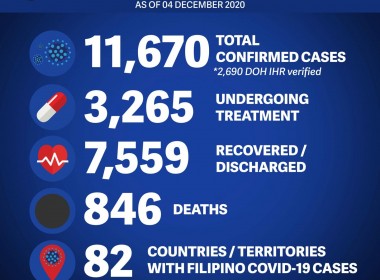 (Eagle News) — Fourteen more Filipinos abroad have recovered from COVID-19. The Department of Foreign Affairs said the additional recoveries pushed the total COVID-19 recoveries among Filipinos overseas to 7559. The DFA said 21 more COVID-19 cases were confirmed, pushing the total to 11670. No new fatalities were reported, which means the death toll remains at 846. The DFA said the Middle East and Africa are still the regions with the most COVID-19 cases, recoveries […]