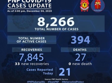 (Eagle News) — Thirty-three more police personnel have recovered from COVID-19. The Philippine National Police said with the additional recoveries, the PNP recovery total rose to 7845 as of December 4. Twenty-one more COVID-19 cases, however, pushed the total to 8266. Of these, 394 were active. No additional death was reported, which means the COVID-19 death toll for police personnel remains at 27. Uniformed personnel, including police personnel, are among the country’s frontliners amid the […]