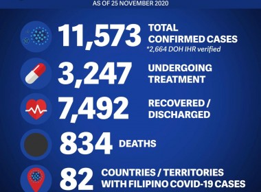 (Eagle News) — Five more overseas Filipinos have recovered from COVID-19. Data from the Department of Foreign Affairs showed the additional recoveries pushed the COVID-19 recoveries among Filipinos abroad to 7492. Six additional COVID-19 cases pushed the total COVID-19 cases to 11573. No additional fatality was reported, which means the death toll remained at 834. The Middle East and Africa still had the most COVID-19 cases, recoveries and deaths among overseas Filipinos, with 7535, 4657, […]