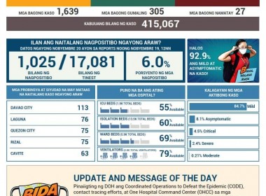 (Eagle News)–COVID-19 cases in the country breached the 415,000 mark on Friday, Nov. 20, after the Department of Health reported 1639 additional cases. The DOH said of the total 415067 COVID-19 cases, 31805 or 7.7 percent were active. Of these, 84.7 percent were mild, 8.1 percent asymptomatic, 2.4 percent severe, 4.5 percent critical, and 0.21 percent moderate. Over 1000, or 1025, cases were confirmed today. The areas with the most COVID-19 cases reported today were […]
