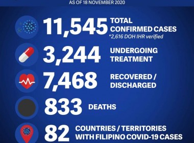 (Eagle News)–The Department of Foreign Affairs has confirmed three additional COVID-19 cases among overseas Filipinos. The DFA said with the additional cases, the total rose to 11545. One new recovery pushed the recovery tally to 7468. One new fatality also pushed the death toll to 833. The DFA said the Middle East and Africa region still had the most COVID-19 cases, recoveries and deaths, with 7530, 4652, and 548, respectively. The Americas had the least […]