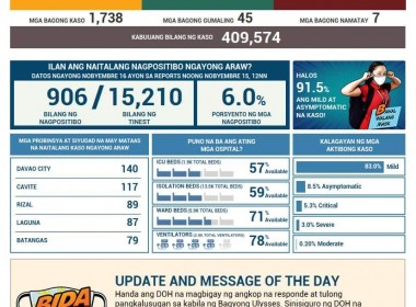 (Eagle News)–COVID-19 cases in the country breached the 409,000 mark on Monday, Nov. 16, after the Department of Health reported 1738 additional cases. The DOH said of the 409574 total cases, 27369 or 6.7 percent were active. Of these, 83 percent were mild, 8.5 percent asymptomatic, 5.3 percent critical, 3 percent severe, and 0.2 percent moderate. Over 900, or 906, of the newly-confirmed cases were confirmed today. The areas with the most COVID-19 cases confirmed […]