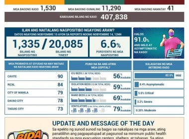 (Eagle News)–COVID-19 cases in the country breached the 407,000 mark on Sunday, Nov. 15, after the Department of Health reported 1530 additional cases. The DOH said of the 407838 total cases, 25677 or 6.3 percent were active. Of these, 82.5 percent were mild, 8.4 percent asymptomatic, 5.6 percent critical, 3.2 percent severe, and 0.2 percent moderate. Over 1000, or 1335, tested positive for COVID-19 today. The areas with the most COVID-19 cases reported today were […]