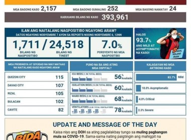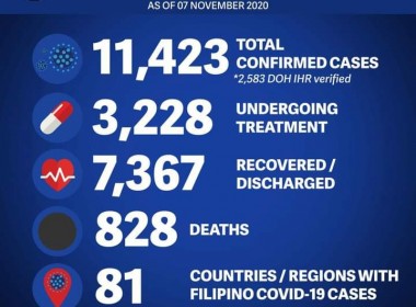 (Eagle News)–COVID-19 cases in the country breached the 393,000 mark on Saturday, Nov. 7, after the Department of Health reported over 2000 more COVID-19 cases. The DOH said of the 393,961 total cases, 9.2 percent or 36260 were active. Of these, 83.7 percent were mild, 10 percent asymptomatic, 4 percent critical, and 2.3 percent severe. Of the 2157 additional cases, 1711 tested positive on Saturday. The areas with the most additional COVID-19 cases reported on […]