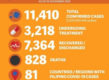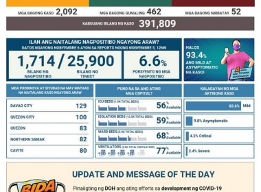 (Eagle News)–COVID-19 cases in the country breached the 391,000 mark on Friday, Nov. 6, after the Department of Health reported over 2000 more COVID-19 cases. The DOH said of the 391,809 total COVID-19 cases, 8.8 percent or 34,374 cases were active. Of these, 83.6 percent were mild, 9.8 percent asymptomatic, 4.2 percent critical, and 2.4 percent severe. Of the 2092 newly-added cases, the DOH said 1714 tested positive today. The areas with the most COVID-19 […]