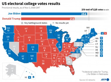 WASHINGTON, United States (AFP) — Democratic presidential challenger Joe Biden on Wednesday neared the magic number of 270 electoral votes needed to win the White House with several battleground states still in play, as incumbent President Donald Trump challenged the vote count. As it stands, there are five states still left uncalled, including major prizes such as Pennsylvania, and key small state Nevada — meaning both Trump and Biden still have a path to […]