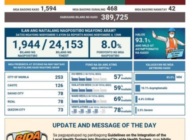 (Eagle News)–COVID-19 cases in the country breached the 389,000 mark on Thursday, Nov. 5, after the Department of Health reported 1594 additional cases. The DOH said of the total 389,725 cases, 8.4 percent or 32773 were active. Of these, 83 percent were mild, 10.1 percent were asymptomatic, 4.4 percent critical, and 2.5 percent severe. The areas with the most COVID-19 cases reported today were Manila with 253, Cavite with 126, Davao City and Rizal with […]