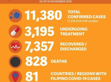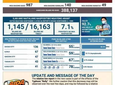 (Eagle News)–COVID-19 cases in the country breached the 388,000 mark on Wednesday, Nov. 4, after the Department of Health reported 987 more cases. This is the lowest number of additional cases reported in a day since July. According to the DOH, of the 388,137 total cases, 8.2 percent or 31679 were active. Of these, 82.6 percent were mild, 10.1 percent asymptomatic, 4.7 percent critical, and 2.6 percent severe. The areas with the most COVID-19 cases […]