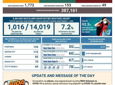 (Eagle News)–COVID-19 cases in the country breached the 387,000 mark on Tuesday, Nov. 3, after the Department of Health reported 1772 additional cases. The DOH said of the 387,161 total cases, 30876 or 8 percent were active. Of these, 82.5 percent were mild, 10 percent asymptomatic, 4.8 percent critical, and 2.7 percent severe. Of the 1772 newly-reported cases, 1016 tested positive today. The DOH said the areas with the most cases reported today were Pampanga […]