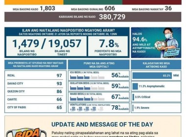 (Eagle News)–COVID-19 cases in the country breached the 380,000 mark on Saturday, Oct. 31, after the Department of Health reported 1803 additional cases. The DOH said of the 380,729 total cases, 42462 or 11.2 percent were active. Of these, 83.2 percent were mild, 11.3 percent asymptomatic, 3.5 percent critical, and 1.9 percent severe. Of the additional 1803 cases, 1469 tested positive today. The areas with the most COVID-19 cases reported today were Rizal with 97, […]