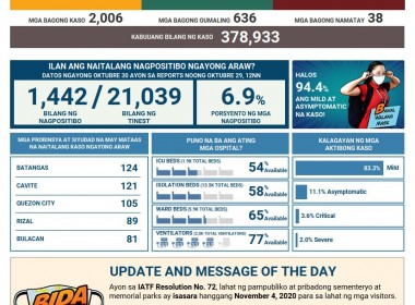 (Eagle News) — COVID-19 cases in the country breached the 378,000 mark on Friday, Oct. 30, after the Department of Health reported 2006 more cases. The DOH said of the total 378,933 cases, 10.9 percent or 41291 were active. Of these, 83.3 percent were mild, 11.1 percent were asymptomatic, 3.6 percent were critical, and 2 percent were severe. Of the 2,006 additional cases, the DOH said 1442 tested positive today. The areas with the most […]
