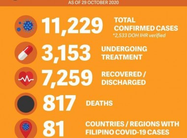(Eagle News)–Five more Filipinos abroad have recovered from COVID-19. With the additional recoveries, the recovery tally rose to 7259. Five additional confirmed cases pushed the total to 11229. No additional fatality was reported, which means the death toll remains at 817. The Middle East and Africa still had the most COVID-19 cases, recoveries and deaths, with 7380 cases, 4542 recoveries, and 532 deaths. The Americas had the least cases and recoveries, at 816 and 481, […]