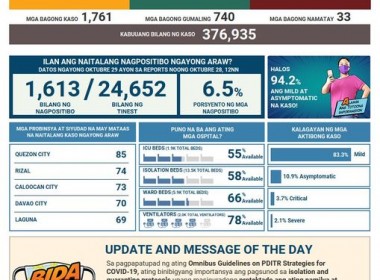 (Eagle News) — COVID-19 cases in the country breached the 376,000 mark on Thursday, Oct. 29, after the Department of Health reported 1761 additional cases. The DOH said of the 376,935 total COVID-19 cases, 39940 or 10.6 percent were active. Of these, 83.3 percent were mild, 10.9 percent asymptomatic, 3.7 percent critical, and 2.1 percent severe. Of the 1761 additional cases, the DOH said 1613 tested positive today. The areas with the most COVID-19 cases […]