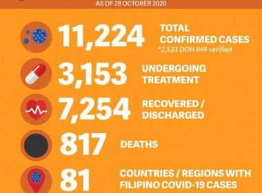 (Eagle News)–Twenty more overseas Filipinos have tested positive for COVID-19. The Department of Foreign Affairs said with the additional ones, the total increases to 11224 as of Wednesday. Six more have recovered, pushing the recovery tally to 7254. Deaths increased to 817, including the additional. The DFA said the Middle East and Africa still had the most COVID-19 cases, deaths and recoveries, with 7380, 532, and 4352, respectively. The Americas had the least cases but […]