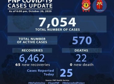 (Eagle News)–Sixty-five more police personnel have recovered from COVID-19. The Philippine National Police said with the addition, the number of COVID-19 recoveries in the PNP rose to 6462. Twenty-five additional COVID-19 cases pushed the total to 7054. Of these, 570 were active. No additional death has been reported, which means the death toll remains at 22. The police are among the country’s frontliners amid the COVID-19 pandemic. PNP Chief Camilo Cascolan has given the assurance […]