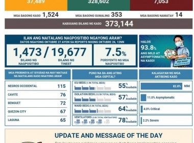 (Eagle News)–COVID-19 cases in the country breached the 373,000 mark on Tuesday, Oct. 27, after the Department of Health reported 1524 additional cases. The DOH said of the 373144 total cases, 10 percent or 37489 were active. Of these, 82.8 percent were mild, 11 percent asymptomatic, 4 percent critical, and 2.2 percent severe. Of the 1524 newly-reported cases, 1473 were cases that tested positive today. The areas with the most cases reported on this day […]