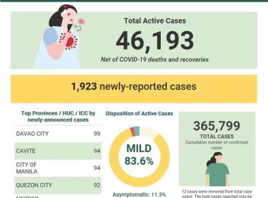 (Eagle News)–COVID-19 cases in the country breached the 365,000 mark on Friday, Oct. 23, after the Department of Health reported almost 2000 additional cases. The DOH said of the 365,799 total cases, 46,193 were active. Of these, 83.6 percent were mild, 11.3 percent asymptomatic, 1.8 percent severe, and 3.2 percent critical. Of the 1923 additional cases reported today, 91 percent or 1745 occurred in the last 14 days. The top regions with the most […]