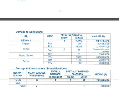 (Eagle News) – Storm Pepito has caused close P121.7 million damage to agriculture and infrastructure, mostly in Region 2 or in Cagayan Valley, according to the National Disaster Risk Reduction and Management Council (NDRRMC). The damage to agriculture alone amounted to P92.46 million in Cagayan, Isabela, Nueva Vizcaya and Quirino. Damage to infrastructure amounted to 29.24 million in Ifugao and Isabela. But the NDRRMC said that this is just the initial amount based on […]
