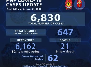 62 additional COVID-19 cases reported (Eagle News)–Thirty-two more police personnel have recovered from COVID-19. The Philippine National Police said with the additional recoveries, the PNP recovery total climbed to 6162 as of Tuesday night. Sixty-two more COVID-19 cases, however, pushed the total to 6830. Of these, PNP data showed 647 were active. The death toll remains at 21 with no additional death reported. PNP Chief Camilo Cascolan has said policemen on modified enhanced community quarantine […]
