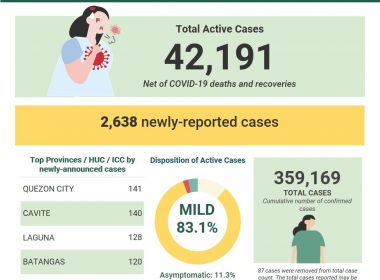 (Eagle News) — COVID-19 cases in the country breached the 359,000 mark on Monday, Oct. 19, after the Department of Health reported 2638 additional cases. The DOH said of the total 359,169 cases, 42191 were active. Of these, 83.1 percent were mild, 11.3 percent asymptomatic, 2.1 percent severe, and 3.6 percent critical. The DOH said of the 2638 additional cases, 1,932 or 73 percent occurred within the recent 14 days (October 6 – October 19, […]