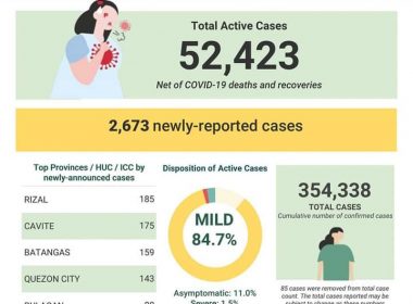 (Eagle News)–COVID-19 cases in the country breached the 354,000 mark on Saturday, Oct. 17, after the Department of Health reported 2673 additional cases. Of the 354,338 total cases, the DOH said 52423 were active. Of these, 84.7 percent were mild, 11 percent asymptomatic, 1.5 percent severe, and 2.9 percent critical. Of the 2673 newly-reported cases, the DOH said Rizal contributed 185, Cavite 175, Batangas 159, Quezon City 143, and Bulacan 88. The DOH said Metro […]