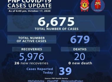 (Eagle News)–Twenty-six more police personnel have recovered from COVID-19. The Philippine National Police said with the additional recoveries, the tally rose to 5976. Thirty-nine additional cases pushed the total PNP cases to 6675. Of these, 679 were active. No additional death was reported, which meant the death toll remained at 20. The police continue to man quarantine checkpoints and enforce laws, making them the country’s frontliners, together with medical workers, amid the COVID-19 pandemic. The […]