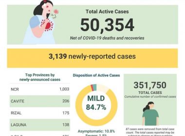 (Eagle News)–COVID-19 cases in the country breached the 351,000 mark on Friday, Oct. 16, after the Department of Health reported over 3,000 more cases. The DOH said of the 351,750 total cases, 50,354 were active. Of these, 84.7 percent were mild, 10.8 percent asymptomatic, 1.5 percent severe, and 3 percent critical. Of the 3139 newly-reported cases, 1003 were from Metro Manila, 206 from Cavite, 175 from Rizal, 138 from Laguna, and 126 from Iloilo. The […]