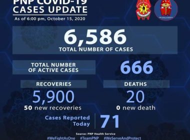 (Eagle News)–Fifty more police personnel have recovered from COVID-19. The Philippine National Police said with the additional recoveries, the total number of police personnel who recovered from tbe disease rose to 5900 as of Thursday night. Seventy-one more COVID-19 cases, however, pushed the total to 6586. Of these, 666 were active. No additional death has been reported, which means the death toll remained at 20. The police continue to man quarantine checkpoints and enforce laws […]