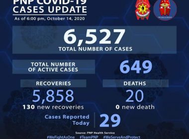(Eagle News)–Over 100 more police personnel have recovered from COVID-19. The Philippine National Police said the added 130 recoveries pushed the recovery tally to 5858 as of Wednesday night. Twenty-nine more COVID-19 cases pushed the total to 6527. Of these, the PNP said 649 were active. The death toll remains at 20 as no additional fatality has been reported. The police continue to man quarantine checkpoints and enforce laws amid the COVID-19 pandemic, making them […]
