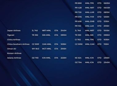(Eagle News)–The Manila International Airport Authority has released its list of operational commercial flights for Thursday, Oct. 8: MIAA said flight schedules may be subject to changes. Travelers were advised to get confirmation of their flights on the day they are supposed to be scheduled as only those with the confirmation will be allowed to enter the airport. Domestic flights are allowed but subject to the requirements imposed by the local government unit covering the […]