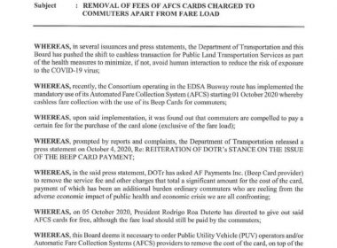 (Eagle News)–The Land Transportation Franchising and Regulatory Board has ordered all public utility vehicle operators and automatic fare collection system (AFCS) operators to remove any charges or fees for the purchase of cards for fare payment on top of the initial load. The LTFRB issued the directive in memorandum circular number 2020-057 after President Rodrigo Duterte said beep cards used in the Edsa bus system should be free. In calling for this, the President noted […]