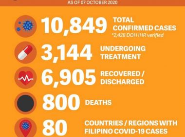 (Eagle News)–Six more COVID-19 cases have been reported among overseas Filipinos, the Department of Foreign Affairs said. The DFA said with the additional cases, the tally of Filipinos abroad with COVID-19 rose to 10,849. Two more have recovered, pushing the recovery total to 6905. The death toll also rose to 800, with an additional death reported. The Middle East and Africa still had the most COVID-19 cases, deaths and recoveries, with 7130, 518, and 4300, […]