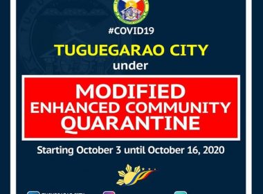 (Eagle News)–Tuguegarao City is now under a modified enhanced community quarantine. The more stringent MECQ starts today, Oct. 3, and will end on October 16 based on Exective Order No. 108 signed by Mayor Jefferson Soriano following his meeting with the Tuguegarao City Task Force against COVID-19. The city government said under the MECQ, all residents are required to stay at home except for those who are allowed to work under the community quarantine and […]