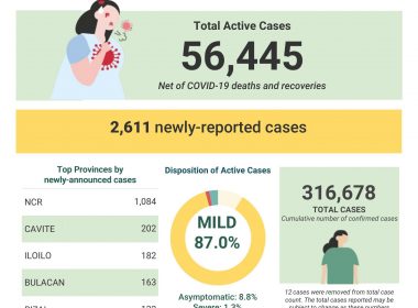 (Eagle News) — COVID-19 cases in the country breached the 316,000 mark on Friday, Oct. 2, after the Department of Health reported additional 2611 cases. The DOH said of the total 316,678 cases, 56445 were active. Of these, 87 percent were mild, 8.8 percent asymptomatic, 1.3 percent severe, and 2.9 percent critical. Of the 2611 new cases, 1084 were from Metro Manila, 202 from Cavite, 182 from Iloilo, 163 from Bulacan and 132 from Rizal. […]