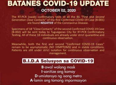 (Eagle News)–Batanes has confirmed its second COVID-19 case. In an advisory, the Batanes provincial government said the second case, like the first one, was asymptomatic. The provincial government said the two cases were in stable condition but were “under strict isolation for continuous observation and management.” Meanwhile, specimens of the 18 close contacts of the second case have been sent today to Tuguegarao City for swab testing. All of the individuals are already under strict […]