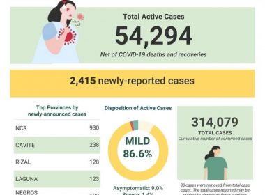 (Eagle News)–The Philippines’ COVID-19 tally rose to 314,079 on Thursday, Oct. 1, after the Department of Health reported 2415 additional cases. The DOH said of the total cases, 54294 were active. Of these, 86.6 percent were mild, 9 percent asymptomatic, 1.4 percent severe, and 3.1 percent critical. Of the 2415 additional cases, 930 were from Metro Manila, 238 from Cavite, 128 from Rizal, 123 from Laguna, and 103 from Negros Occidental. Recoveries rose to 254223, […]