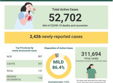 (Eagle News) — COVID-19 cases in the country breached the 311,000 mark on Wednesday, Sept. 30, after the Department of Health reported 2426 additional cases. The DOH said of the 311,694, 52702 were active. Of these, 86.4 percent were mild, 9.0 asymptomatic, 1.4 percent severe, and 3.2 percent critical. Of the 2426 newly-announced cases, 887 were from Metro Manila, 201 from Cavite, 147 from Rizal, 115 from Negros Occidental, and 99 from Batangas. The DOH […]