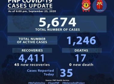 (Eagle News)–The Philippine National Police has reported 45 additional COVID-19 recoveries, pushing the recovery tally to 4411. The PNP said the figures were as of Friday night, Sept. 25. No additional COVID-19 death means the death toll remains at 17. Thirty-five additional COVID-19 cases were reported, however, pushing the total to 5674. The PNP has vowed to continue to man quarantine checkpoints amid the COVID-19 pandemic, making the police one of the country’s frontliners. PNP […]