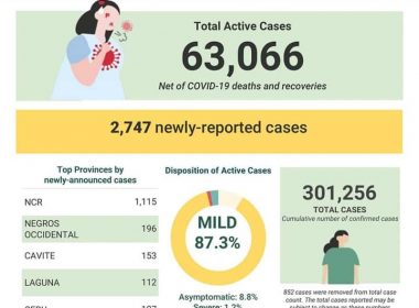 (Eagle News)–COVID-19 cases in the country breached the 301,000 mark on Saturday, Sept. 26, after the Department of Health reported additional 2747 cases. The DOH said of the 301256 total cases, 63066 were active. Of these, 87.3 percent were mild, 8.8 percent asymptomatic, 1.2 percent severe, and 2.7 percent critical. Of the 2747 newly-reported cases, 1115 came from Metro Manila, 196 from Negros Occidental, 153 from Cavite, 112 from Laguna, and 107 from Cebu. Recoveries […]